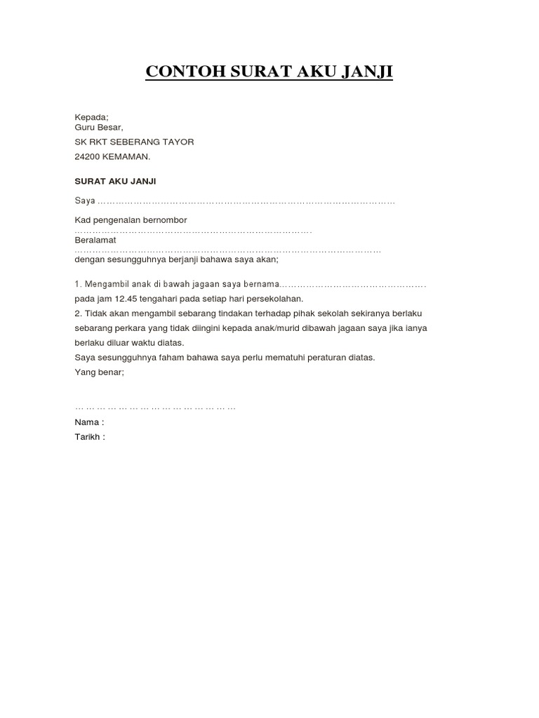 Contoh surat aku janji pekerja. Saya sesungguhnya faham bahawa jika saya disabitkan kerana telah melanggar Aku Janji ini saya boleh dikenakan tindakan tatatertib mengikut Peraturan-Peraturan Pegawai Awam.
